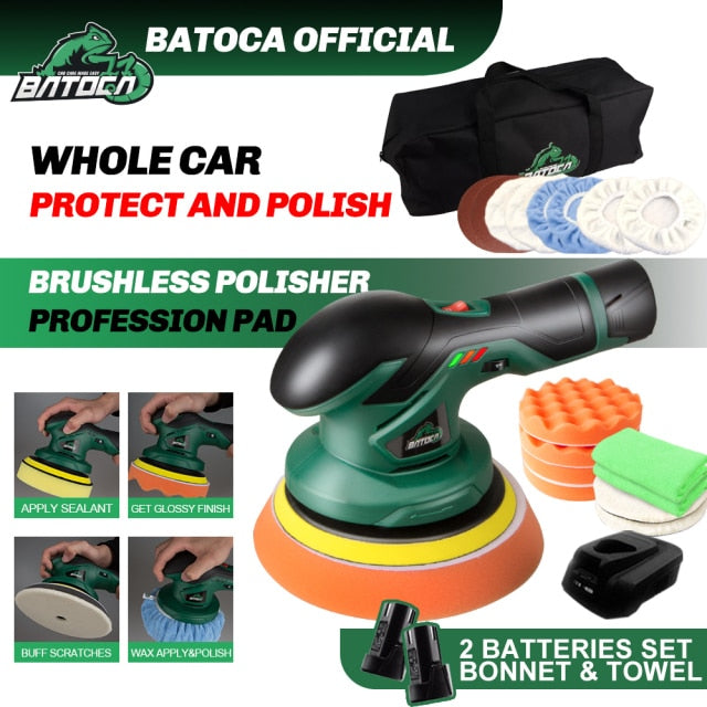 BATOCA Cordless Car Polisher 12V Wireless DA Car Polishing Machine Brushless Dual Action Buffer Free 2pcs 2.0Ah Lithium Battery